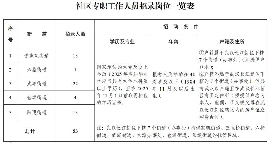 详见社区专职工作人员招录岗位一览表(附件1)。