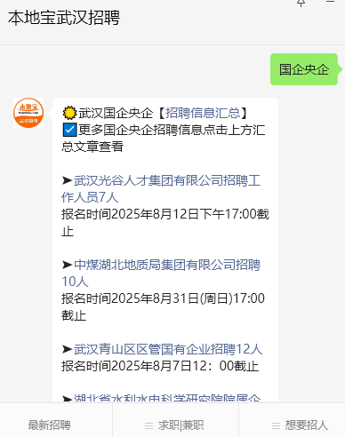 温馨提示:微信搜索并关注【本地宝武汉招聘】,在对话框回复【国企央企】获取武汉更多国企央企社会招聘/校园招聘最新消息,报名入口、岗位条件等。